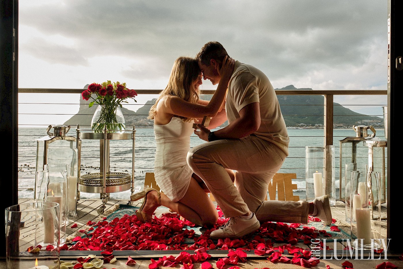 Daniel's heart raced as he walked back to the room with Micaela. In Hout Bay, the sun dipped towards the horizon, casting a golden glow across the ocean. This was it—the moment he had been waiting for. He'd been planning Micaela's Tintswalo sunset wedding proposal for some time.